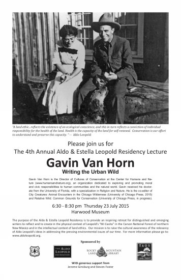 The purpose of the Aldo and Estalla Leopold Residency is to build on that legacy by inspiring the next generation of citizens to participate in the evolution of the land ethic through the written word.